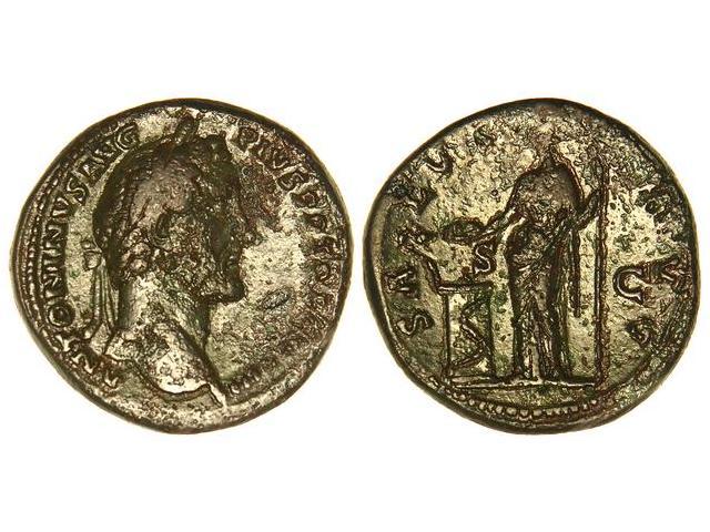 ROMAN COINS: ROMAN EMPIRE - Sestercio. Acuñada el 145 d.C. ANTONINO PÍO. Anv.: ANTONINVS AVG. PIVS P. P. TR. P. COS. IIII. Busto laureado a derecha. Rev.: SALVS AVG. S. C. Salud en pie a izquierda. Pátina marrón verdosa. (Algunas oxidaciones). C-711. MBC.