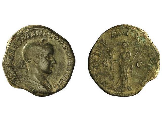 ROMAN COINS: ROMAN EMPIRE - Sestercio. Acuñada el 238-239 d.C. GORDIANO III. Anv.: IMP. CAES. M. ANT. GORDIANVS AVG. Busto laureado a derecha. Rev.: FIDES MILITVM S. C. Fe en pie a izquierda con cetro y estandarte. Pátina verde. C-88. MBC/MBC-.