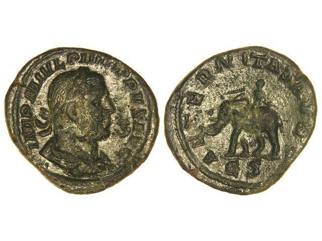 ROMAN COINS: ROMAN EMPIRE - Sestercio. Acuñada el 244-249 d.C. FILIPO I. Anv.: IMP. M. IVL. PHILIPPVS AVG. Busto laureado a derecha. Rev.: AETERNITAS AVGG. C. S. Elefante en marcha a izquierda. Pátina verde con dos tonos. C-18, error en reverso C.S. en lugar de S.C. (MBC+).