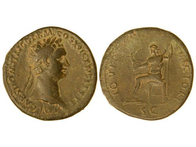 ROMAN COINS: ROMAN EMPIRE - Sestercio. Acuñada el 90-91 d.C. DOMICIANO. Anv.: IMP. CAES. DOMIT. AVG. GERM. COS. XV CENS. PER. P. P. Cabeza laureada a derecha. Rev.: IOVI VICTORI S. C. Júpiter, sedente a izquierda con cetro y Victoria. C-314. MBC.