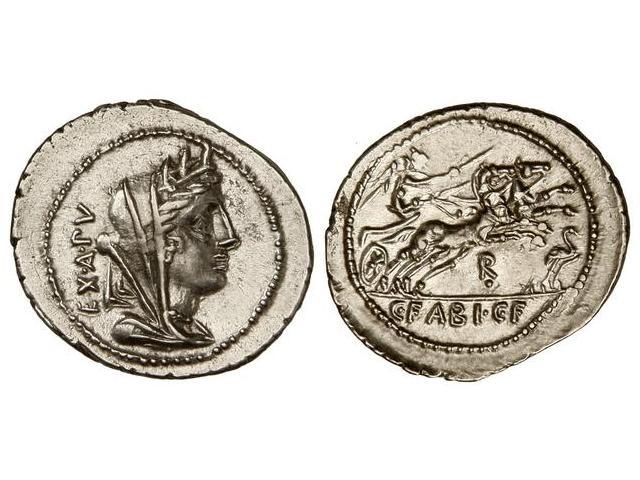 ROMAN COINS: ROMAN REPUBLIC - Denario. 104 a.C. FABIA-14. C. Fabius C. f. Hadrianus. Anv.: Cabeza velada de Cibeles con corona mural a derecha, detrás EX. A. PV. Cal-575; FFC-703. EBC.