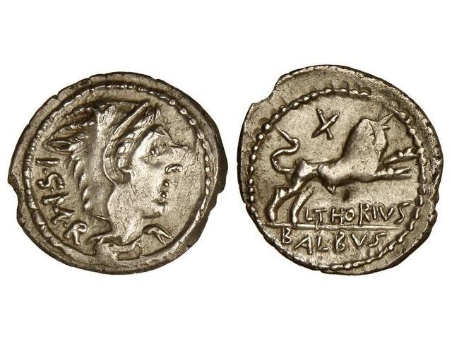 ROMAN COINS: ROMAN REPUBLIC - Denario. 105 a.C. THORIA-1. L. Thorius Balbus. Anv.: Cabeza de Juno Sospita a derecha, cubierta con piel de cabra, detrás I.S.M.R. (Pequeñas rayitas). Cal-1300; FFC-1141. MBC+.