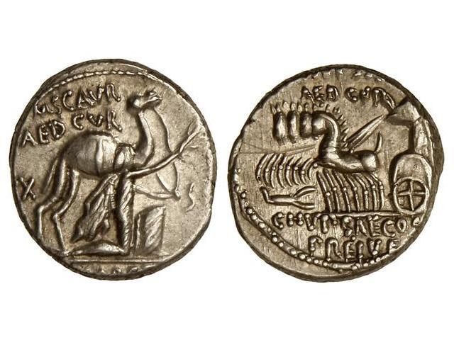 ROMAN COINS: ROMAN REPUBLIC - Denario. 58 a.C. AEMILIA-8. M. Aemilius Scaurus y Pub. Plautius Hysaeus. Anv.: Rey Aretas de rodillas, detrás camello, encima M. SCAVR. AED. CVR., a los lados EX-S.C. En exergo: REX. ARETAS. (Rayitas en reverso). FFC-120. <B