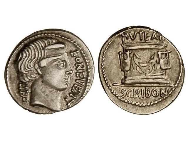 ROMAN COINS: ROMAN REPUBLIC - Denario. 62 a.C. SCRIBONIA-8a. L. Scribonius Libo. Rev.: Pozo scriboniano adornado con guirnaldas laterales, debajo martillo. En exergo: SCRIBON, encima PVTEAL. Cal-148; FFC-1102. MBC+.