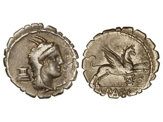 ROMAN COINS: ROMAN REPUBLIC - Denario. 79 a.C. PAPIA-1. L. Papius. Anv.: Cabeza de Juno Sospita a derecha, tocado con piel de ciervo, detrás símbolo. (Pequeñas oxidaciones). Cal-1057; FFC-952. MBC+.