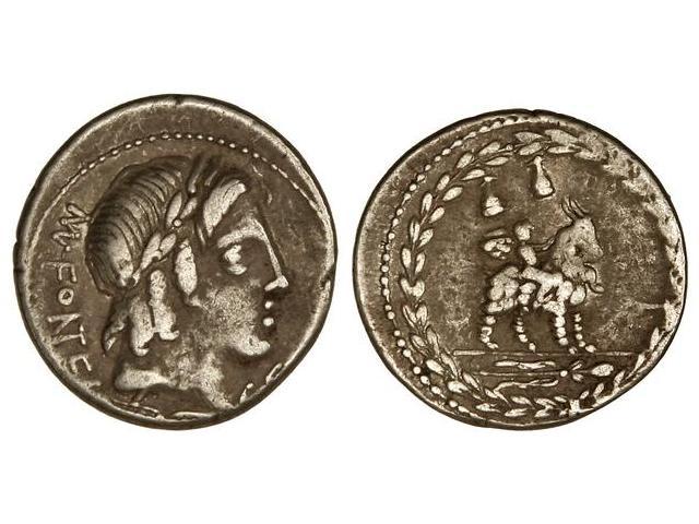 ROMAN COINS: ROMAN REPUBLIC - Denario. 85 a.C. FONTEIA-10. MN. Fonteius C. f. Anv.: Cabeza de Apolo delante C.F. FONTEI., debajo haz de rayos. Rev.: Genio sobre cabra. (Anverso algo descentrado). Cal-590; FFC-719. nMBC-.