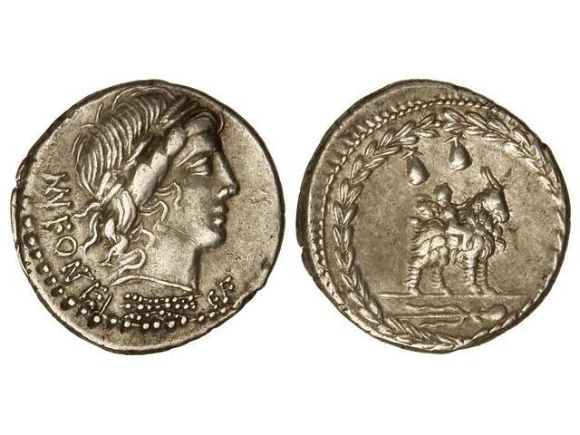 ROMAN COINS: ROMAN REPUBLIC - Denario. 85 a.C. FONTEIA-10. Mn. Fonteius C. f. Anv.: Cabeza laureada de Apolo Vejovis a derecha, delante C.F., detrás MN. FONTEI. Cal-590; FFC-719. MBC+.