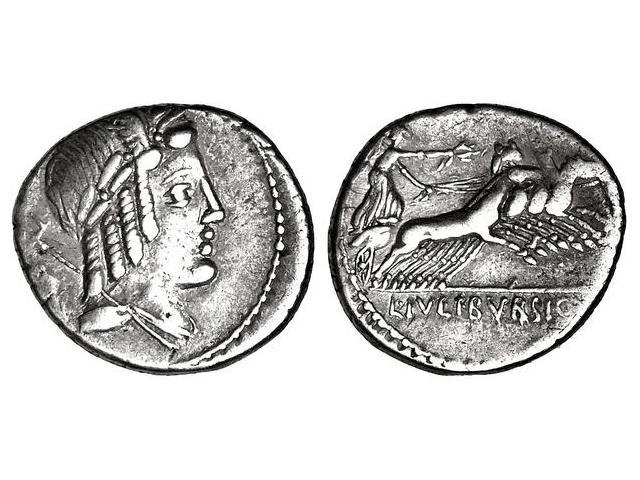 ROMAN COINS: ROMAN REPUBLIC - Denario. 85 a.C. JULIA-5. L. Julius Bursio. Rev.: Cuadriga a derecha. En exergo: L. IVLI. BVRSIO. (Ligeramente descentrada en anverso). Cal-634; FFC-767. MBC.
