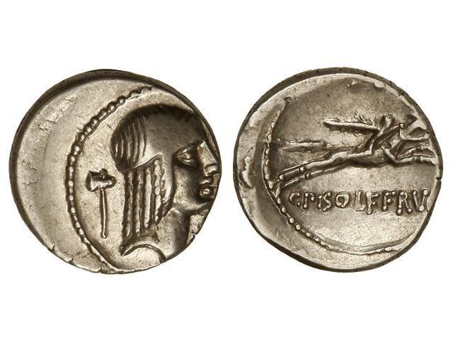 ROMAN COINS: ROMAN REPUBLIC - Denario. 90-89 a.C. CALPURNIA. C. Calpurnius Piso Frugi. Anv.: Cabeza diademada de Apolo a derecha, símbolo detrás. Rev.: Jinete con palma a derecha, sin símbolos ni marcas. MBC/MBC+.