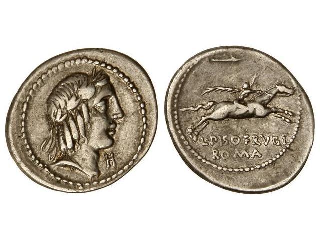 ROMAN COINS: ROMAN REPUBLIC - Denario. 90-89 a.C. CALPURNIA. L. Calpurnius Piso Frugi. Anv.: Cabeza laureada, debajo mentón letra H. Rev.: Jinete con palma, encima símbolo. Cal-310h; FFC-296. MBC+.
