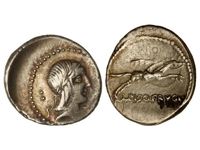 ROMAN COINS: ROMAN REPUBLIC - Denario. 90-89 a.C. CALPURNIA. L. Calpurnius Piso Frugi. Anv.: Cabeza laureada de Apolo a derecha, detrás dos puntos. (Descentrada en anverso). Cal-¿311b?; FFC-¿299?. MBC+.