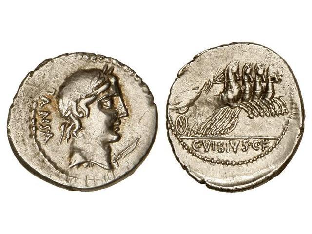 ROMAN COINS: ROMAN REPUBLIC - Denario. 90 a.C. VIBIA-1. C. Vibius C. f. Pansa. Anv.: Cabeza laureada de Apolo a derecha, debajo de barbilla símbolo, detrás PANSA. (Acuñación floja en parte. Rayita en reverso). Cal-1345; FFC-1187. EBC-.