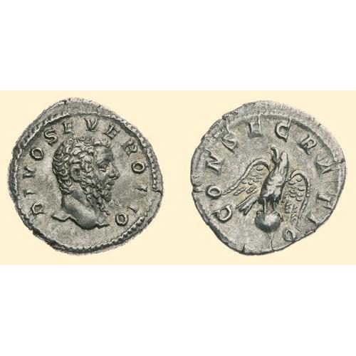 AR Denarius (2.92 g), after 211 AD. DIVO SEVERO PIO, head of Septimius Severus right / CONSECRATIO, eagle, his head turned left, standing on globe. C. 84; RIC 239, 191 c.