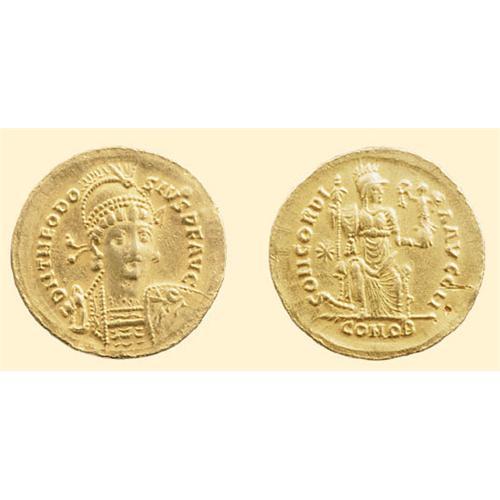 AV Solidus (4.46 g). Constantinople. DN THEODO-SIVS PF AVG, diademed, helmeted and cuirassed bust of Theodosius II three-quarters facing, holding spear and shield / CONCORDI-A AVGG H / CONOB, Constantinopolis seated facing, holding scepter and globe upon which stands Victory extending a wreath; star in left field, officina H. DO 316. RIC 202.