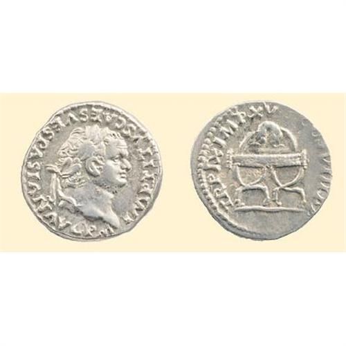 AR Denarius (3.44 g). IMP TITVS CAES VESPASIAN AVG PM, laureate head of Titus right / TRP IX IMP XV COS VIII PP, curule chair with wreath. C. 318; RIC 25a; BMCRE 66.