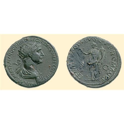AE Dupondius (11.33 g). 114-117 AD. IMP CAES NER TRAIANO OPTIMO AVG GER DAC P M TR P COS VI P P / S-C, radiate draped bust right / Felicitas holding a caduceus and cornucopiae. C. 353; RIC 674.