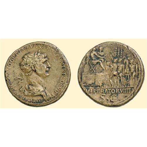 AE Sestertius (26.52 g). 114-117 AD. IMP CAES NER TRAIANO OPTIMO AVG GER DAC P M TR P COS VI P P, laureate and draped bust of Trajan right/ IMPERATOR VIIII / S C, Trajan seated on a platform, addressing his soldiers. C. 178 var.; RIC 658.