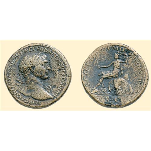 AE Sestertius (26.09 g). 114-117 AD. IMP CAES NER TRAIANO OPTIMO AVG GER DAC P M TR P COS VI P P, laureate and draped bust of Trajan right / IMPERATOR VIIII / SPQR OPTIMO PRINCIPI / S C, Minerva seated left on a pile of arms, holding a victory and scepter. C. 391; RIC 489.