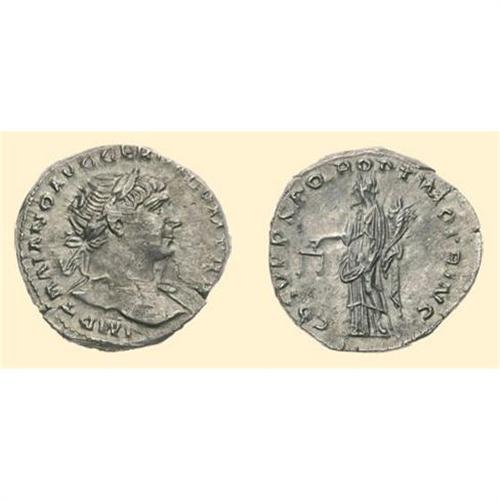 AR Denarius (3.43 g). 103-111 AD. IMP TRAIANO AVG GER DAC P M TR P, laureate head of Trajan right / COS V P P SPQR O[PTIMO PRINCIPI], Aequitas standing left. C. 86; RIC 252, 119.