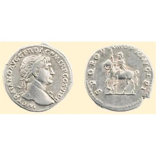 AR Denarius (3.28 g). 112-114 IMP TRAIANO AVG GER DAC PM TRP COS VI PP, laureate bust of Trajan right / SPQR OPTIMO PRINCIPI, Trajan on horseback, wearing paludamentum, his right hand raised. C. 497; RIC 264, 291.