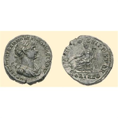 AR Denarius (3.17 g). 114-117 AD. IMP CAES NER TRAIANO OPTIMO AVG, laureate, draped and cuirassed bust of Trajan right / P M TR P COS VI P P SPQR / FORT RED, Fortuna seated left. C. 154; RIC 267, 318.