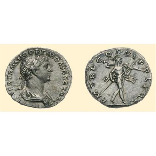 AR Denarius (3.23 g). 114-117 AD. IMP CAES NER TRAIANO OPTIMO AVG, draped and cuirassed bust of Trajan right / P M TR P COS VI P P SPQR, Mars striding right, with trophy and lance. C. 270; RIC 268, 337.
