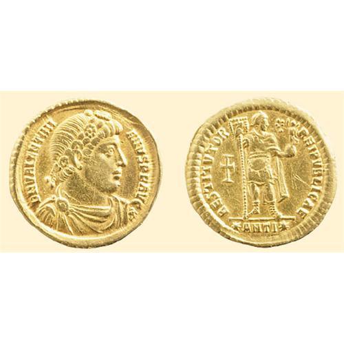 AV Solidus (4.36 g). Antioch. DN VALENTINI-ANVS PF AVG, draped cuirassed bust of Valentinian I right, wearing rosette diadem / RESTITVTOR REIPVBLICAE / *ANTI*, Valentinian standing right, holding standard and Victory on globe; cross at left. RIC 2(b), mintmark xxxviii.