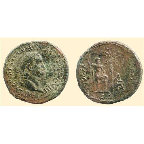 AE 35 Sestertius (25.12 g). 71 AD. Laureate head of Vespasian right / IVDAEA CAPTA / S C, emperor stganding right before a palm tree, foot on helmet, holding lance and sword in scabbard, Jewess weeps nearby. RIC 427; BMCRE 546; Hendin 775. Obverse double-struck; but the portrait and reverse type nonetheless clear