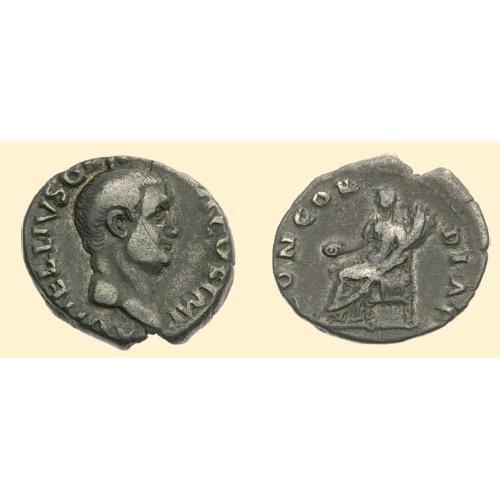 AR Denarius (2.88 g). A VITELLIVS GERMANICVS IMP, head of Vitellius right / CONCOR-DIA P R, Concordia seated left. C. 21; RIC 66.
