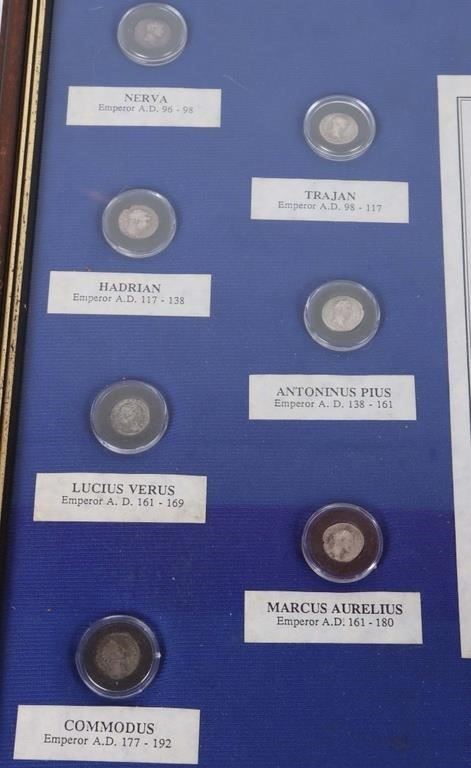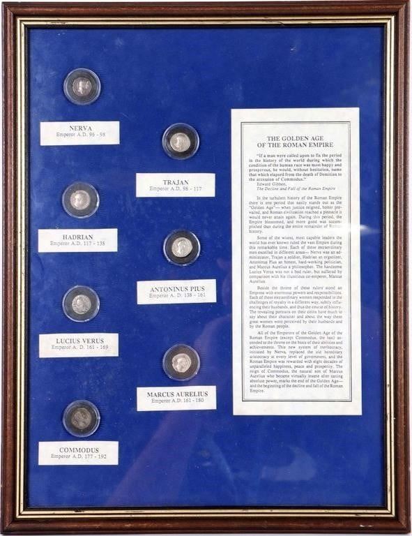 Step back in time with this exceptional collection of ancient Roman coins, each depicting a different emperor from the golden age of the Roman Empire. This unique lot includes seven coins, beautifully framed and ready to display, making it a perfect addition for collectors and history enthusiasts alike. The collection consists of coins featuring Nerva, Trajan, Hadrian, Antoninus Pius, Lucius Verus, Marcus Aurelius, and Commodus. The coins are in good to very fine condition. The entire collection is professionally framed for an elegant display.
