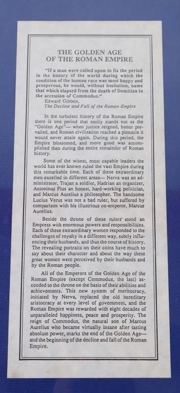 These authentic ancient Roman coins are rich in historical significance. Nerva, who reigned from 96-98 AD, is known for stabilizing the empire after the turbulent end of Domitian's reign. Trajan, reigning from 98-117 AD, expanded the Roman Empire to its greatest territorial extent. Hadrian, ruling from 117-138 AD, is renowned for his extensive building projects and the famous Hadrian's Wall in Britain. Antoninus Pius, from 138-161 AD, is remembered for his peaceful and prosperous reign. Lucius Verus, co-emperor with Marcus Aurelius from 161-169 AD, is noted for military campaigns in the East. Marcus Aurelius, who reigned from 161-180 AD, is the philosopher-king, author of "Meditations," and a model of Stoic virtue. Finally, Commodus, ruling from 180-192 AD, is notorious for his eccentric and autocratic rule, depicted in various historical works and films.