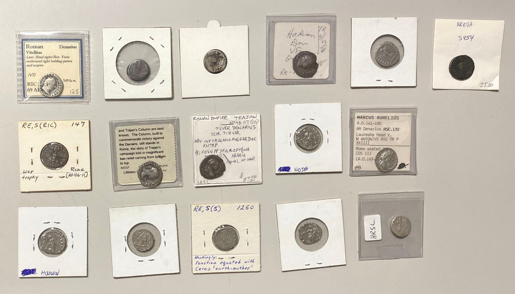ROMAN EMPIRE: LOT of 16 early AR denarii, including Vitellius (G-VG), Vespasian (3 pcs), Nerva, Trajan (3), Hadrian, Antoninus Pius (2), Faustina Sr (2), and Marcus Aurelius (3); various grades between Good and VF, with most of the latter half of the lot VF, some coins with surface corrosion or cleaning, all identified on accompanying holders; retail value $750, lot of 16 pieces.