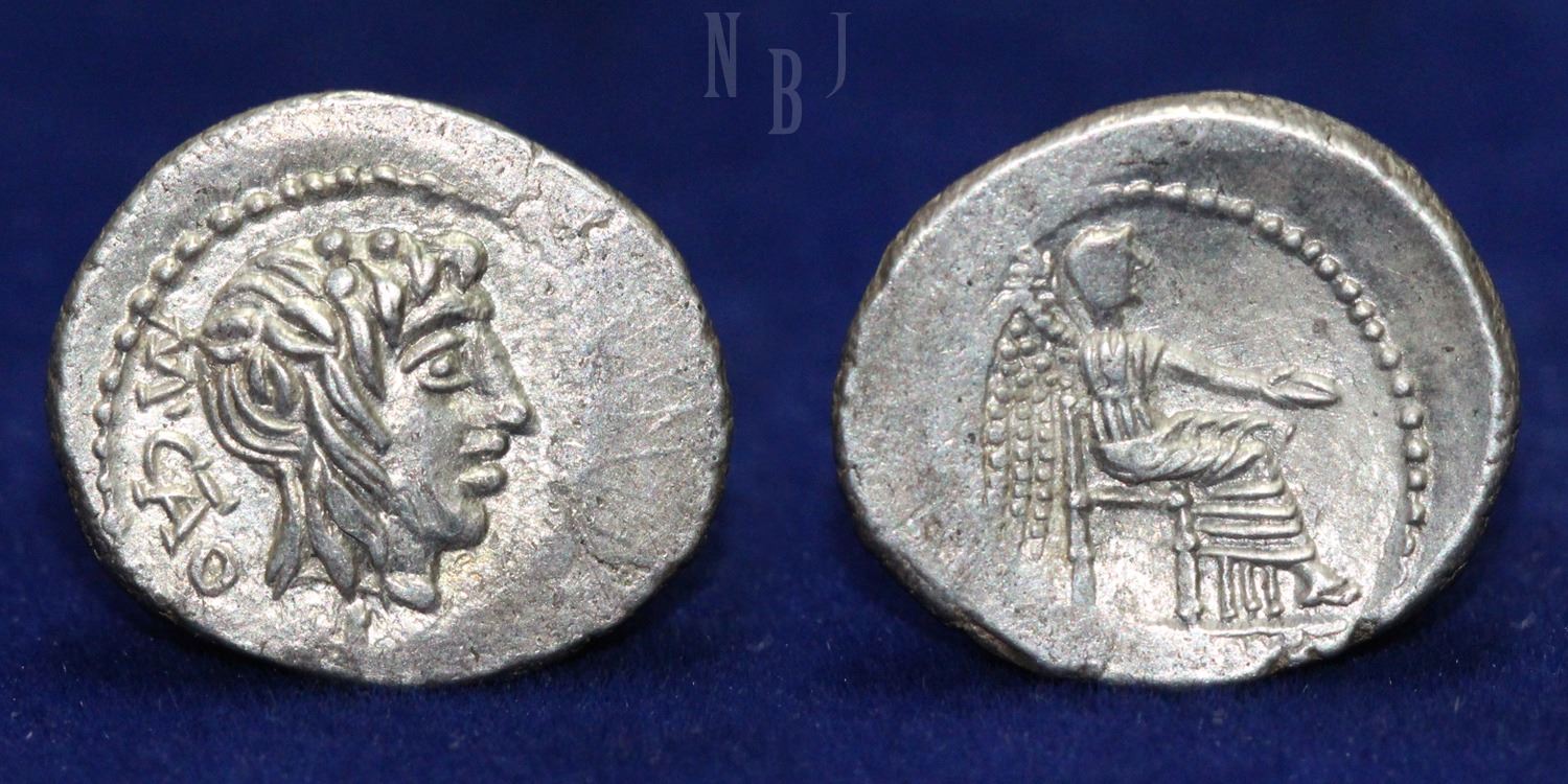ROMAN EMPIRE: M. Cato. AR Quinarius, 89 BC. Obv. Head of Liber right, wearing ivy-wreath; behind, M·CATO (AT ligate). Rev. Victory seated right, holding patera and palm branch; in exergue, VIC[TRIX] (TR ligate), 2.25gm, 16mm, Good Very Fine.