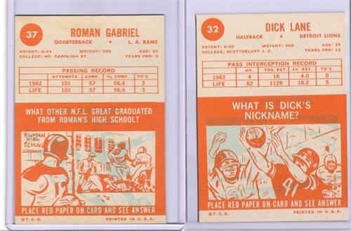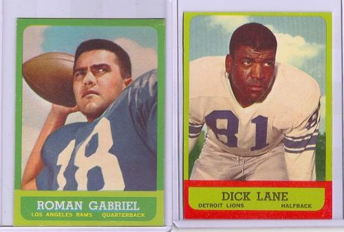 ROMAN GABRIEL & DICK ‘NIGHT TRAIN’ LANE FOOTBALL CARDS. Consists of one Roman Gabriel 1963 Topps football card. #37. Ungraded. Also consists of one Dick ‘Night Train’ Lane 1963 Topps football card. #32. Ungraded.