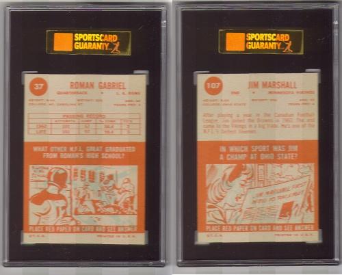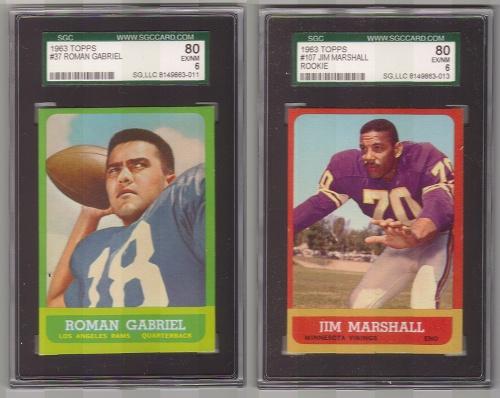 ROMAN GABRIEL & JIM MARSHALL FOOTBALL CARDS. Consists of one Roman Gabriel 1963 Topps football card. #37. Graded by SGC. 80. EX/NM 6. 8149863-011. Also consists of one Jim Marshall 1963 Topps Rookie football card. #107. Graded by SGC. 80. EX/NM 6. 8149863-013.
