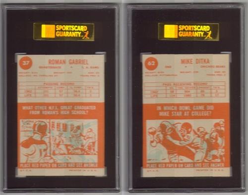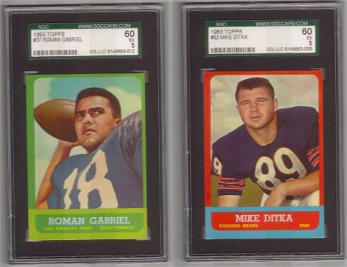 ROMAN GABRIEL & MIKE DITKA FOOTBALL CARDS. Consists of one Roman Gabriel 1963 Topps football card. #37. Graded by SGC. 60. EX 5. 8149863-012. Also consists of one Mike Ditka 1963 Topps football card. #62. Graded by SGC. 60. EX 5. 8149863-006.