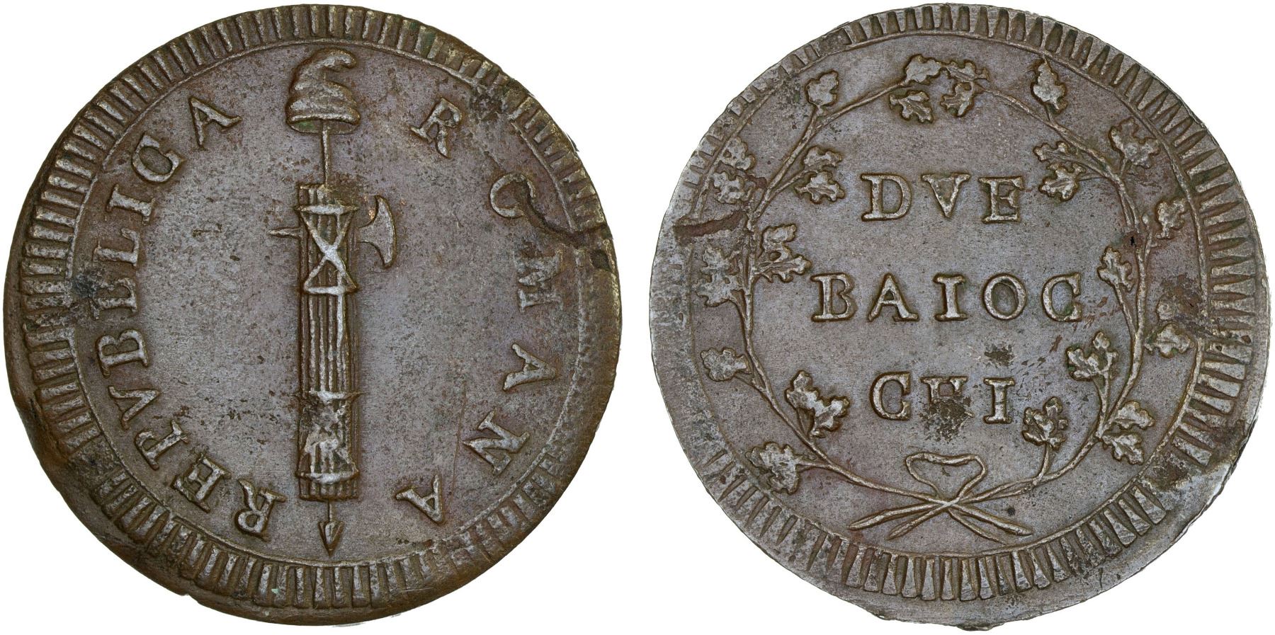 ROMAN REPUBLIC: AE 2 baiocchi, ND (1799), KM-7.5, Cr-6.5, Montenegro-34, edge defect, but wonderful full strike, attractive, VF-XF.