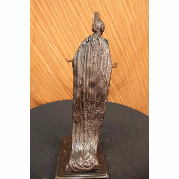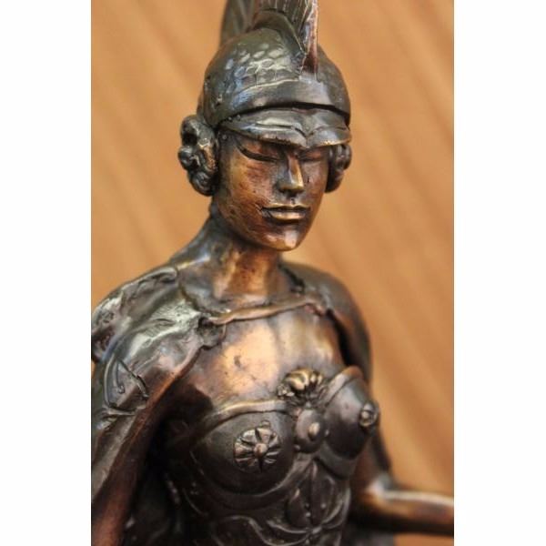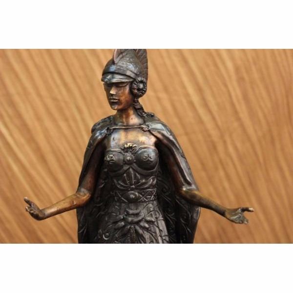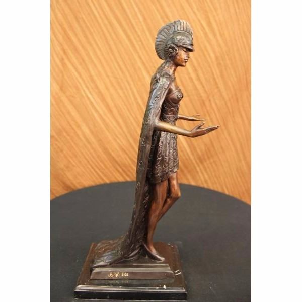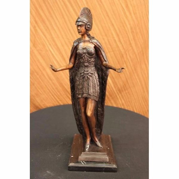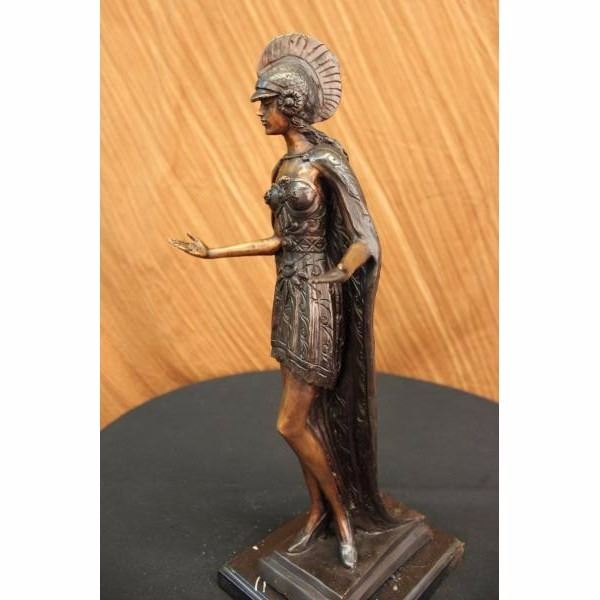 The beholder comes across a gladiatrix, which was the female counterpart to the male gladiator. Though very rare gladiatrices are attested in archaeology and literature. It was only possible for a woman to fight in a gladiatorial game if she was able to access any form of professional training. She is seen nude except for the sandals she is fastening and the bronze galea armoring her head. She seems to have a calm demeanor and grace as she poses to take on man, beast and death. The handmade bronze sculpture was molded using the ancient method of lost-wax casting and stained with a brown color Special patina finish for preservation. It is mounted upon a black marble base and is signed by artist. Condition: This sculpture is in perfect condition. Bronze Dimensions with Marble Base:Height 19" x Width 9" Marble Dimensions: 8" X 6" . Height without base: 18" Weight : 13 LBS Inventory: 89-97086M9098