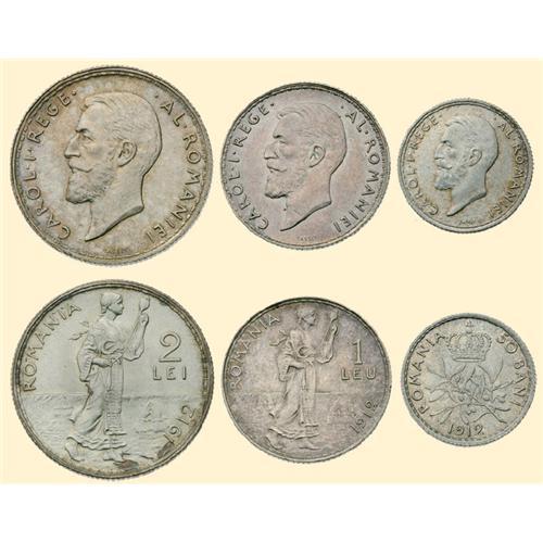 1912 Complete Three Coin Uncirculated Set, Brussels: 50 Bani, 1 Leu, 2 LEI, all in silver (2.5 g, 5 g, 10 g.), all with head of Carol I left, TASSET under neck, reverse of 50 Bani with olive branch and value, the 1 and 2 Lei coins depicts a peasant woman in a wheat field. MBR. 50, 60, 67 pp. 261-262; KM 41, 42, 43.