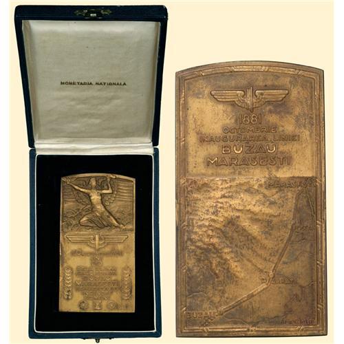 Bronze plaque (104 x 56 mm) commemorating 60 years 1881-1941 of the first railway line built by Romanian engineers. 1881 OCTOMBRIE 1941 - ANI 60 - DE LA PRIMA CALE FERATA BUZAU MARASESTI REALIZATA DE INGINERI, Icarus and the winged symbol of the railways / 1881 OCTOMBRIE INAUGURAREA LINIEI BUZAU MARASESTI, map of the line, ARH. C. IOTZU below to right. With original box of issue from National Mint (Monetaria Nationala).