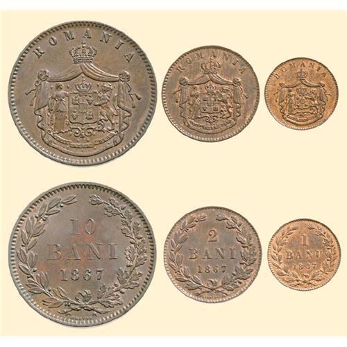 1, 2, 5, 10 BANI 1867; bronze; Heaton - Birmingham. Shield, Dacia and lion standing, "NIHIL SINE DEO" on ribbon, " ROMANIA" below / the value and year between two garlands. MBR. p. 255-256, 1a, 2a, 3a, 4a; KM 1.1, 2.1, 3.1, 4.1.