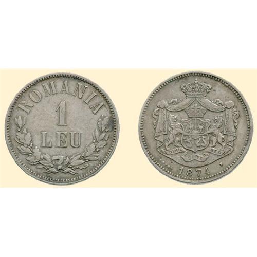 ROMANIA COINS 1 LEU 1874, silver (5 g), Brussels. The value b