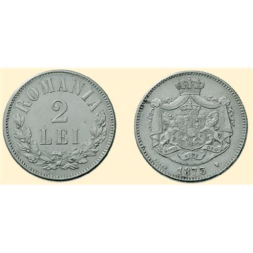 2 LEI 1873, silver (10 g), Brussels. The value between two garlands, "ROMANIA" above / emblem, 1873 below, between the engraver`s name Stern and the mint mark, 2-L on side. MBR. p. 257, 18; KM 8.
