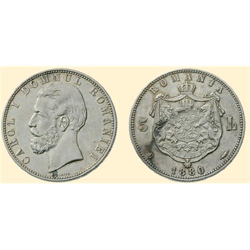5 LEI 1880, silver (25 g), Bucharest. CAROL I DOMNUL ROMANIEI, portrait left, KULLRICH on the circle / emblem, ROMANIA above, 1880 between letter B and a blade of wheat, 5 - L on sides. MBR. p. 263, 74; KM 12.