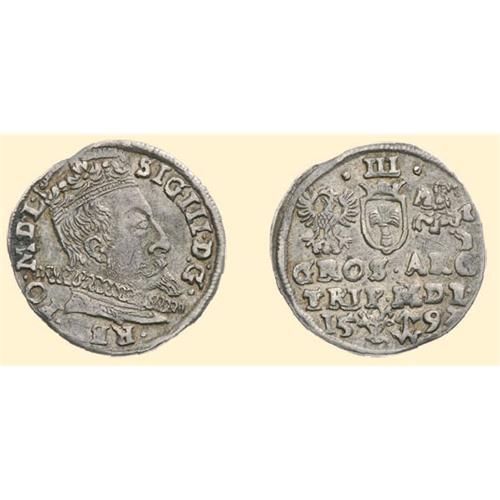 AR 3 Gros (20 mm, 1.06 g). SIG*III*D*G*-*RIX*PO*M*D*L. Crowned and armored bust of Sigismond III right / GROS*ARG/TRIP*M*D*L*/15-97, Polish eagle left, arm of Wasa in shield topped by royal crown, Lithuanian horseman right, bull`s head (emblem of coin master Dimitri Chaleczki) below. MBR, 820 var.