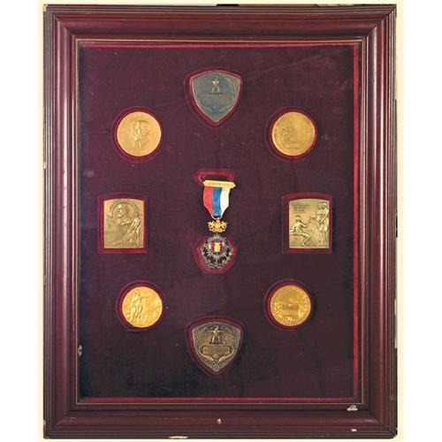 Framed set of 8 medals and one badge probably made for display at the Universal Exposition of 1906 in Bucharest. These include USA - GOLD MEDAL LOUISIANA PURCHASE EXPOSITION, 2 pieces; ROMANIA - 1866-1906 CAROL I DOMN SI PRIMUL REGE AL ROMANIEI / 1906 EXPOZITIUNEA GENERALA ROMANA DIN BUCURESTI; ROMANIA - plaque designed by R. Cizek and made by Resch, CAROL I REGE AL ROMANIEI - 1866-1906 - COLABORATORILOR NOSTRI / EXPOZITIA GENERALA ROMANA DIN 1906; UK - gilt bronze medal by Massonet Edit., INTERNATIONAL EXHIBITION OF HEALTH FOOD & HYGIENE - LONDON 1906; UK - badge of the exhibition in enameled bronze. An impressive and highly interesting set.