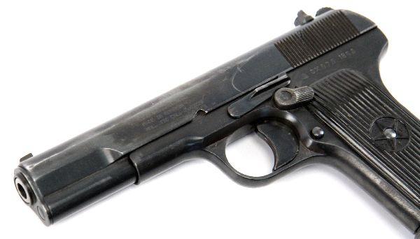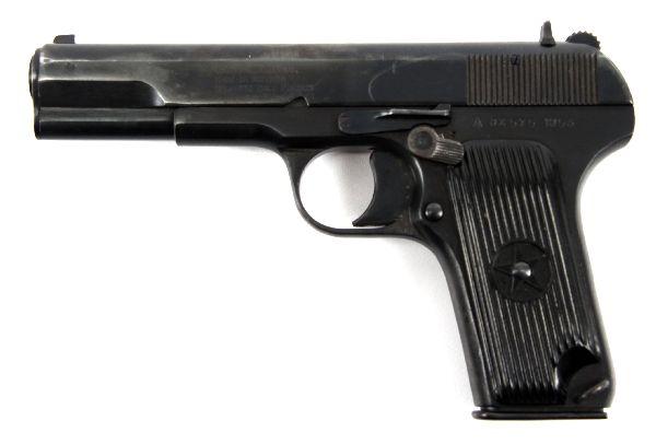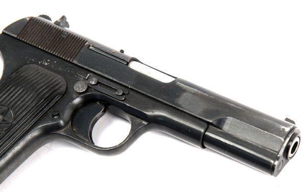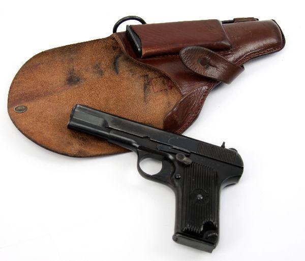 Romanian Model TTC Tokarev pistol, with leather holster, extra magazine, and cleaning rod. Dated 1953. Import marked CAI Georgia, Vt. Bore is very good and clean, bluing about 80%, with mild handling and holster wear, and grips are excellent Overall very good condition. SN: DX575 Caliber: 7.62 x 25 Serial #: DX575