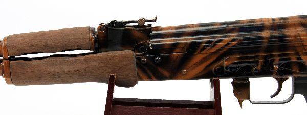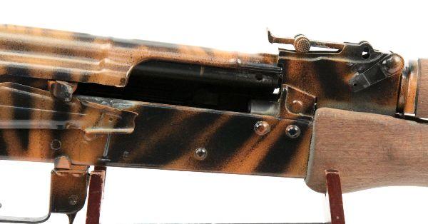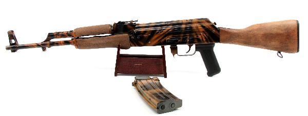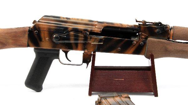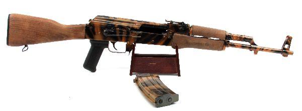 Romanian WASR-3 rifle, chambered in 5.56 x 45 NATO (.223 Rem). Design based on the AK-47 series of rifles and variants. Manufactured in Romania, and imported by CAI, Georgia, VT. Bore and stock are very good. Finish is custom camouflage, over the original black matte finish. Overall good to very good condition. Extra magazine included. sn3-12761-06 Caliber: .223 Serial #: 3-12761-06