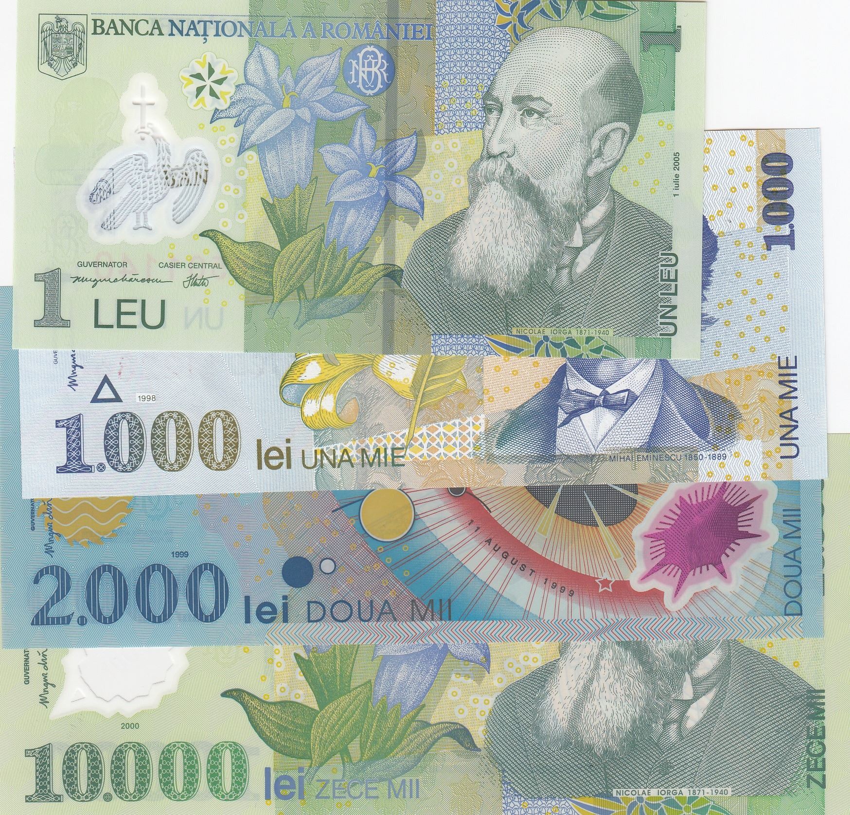 Romania, 1 Lei, 1000 Lei, 2000 Lei and 10000 Lei, UNC, p117i/ p106/ p111a/ p112a, (Total 4 Banknotes)