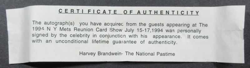 COA STATING AUTOGRAPH ACQUIRED AT THE 1994 NY METS REUNION CARD SHOW. EST 30.00-40.00